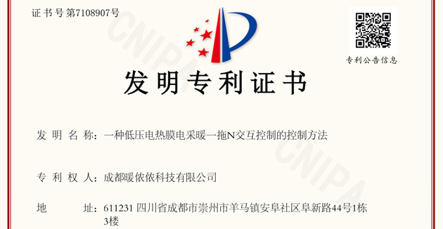 在科技日新月異、競(jìng)爭(zhēng)激烈的當(dāng)今時(shí)代,創(chuàng)新成為了企業(yè)發(fā)展的核心驅(qū)動(dòng)力。2024年6月18日,成都暖儂儂科技有限公司歷時(shí)兩年多的時(shí)間,成功獲得國(guó)家知識(shí)產(chǎn)權(quán)局一項(xiàng)發(fā)明專利授權(quán):一種低壓電熱膜電采暖一拖N交互控制的控制方法(專利號(hào)ZL 2021 1 1224805.0)。