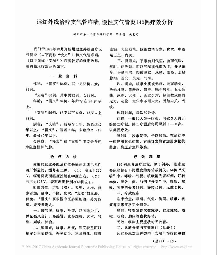 遠紅外線治療支氣管哮喘、慢性支氣管炎140例療效分析